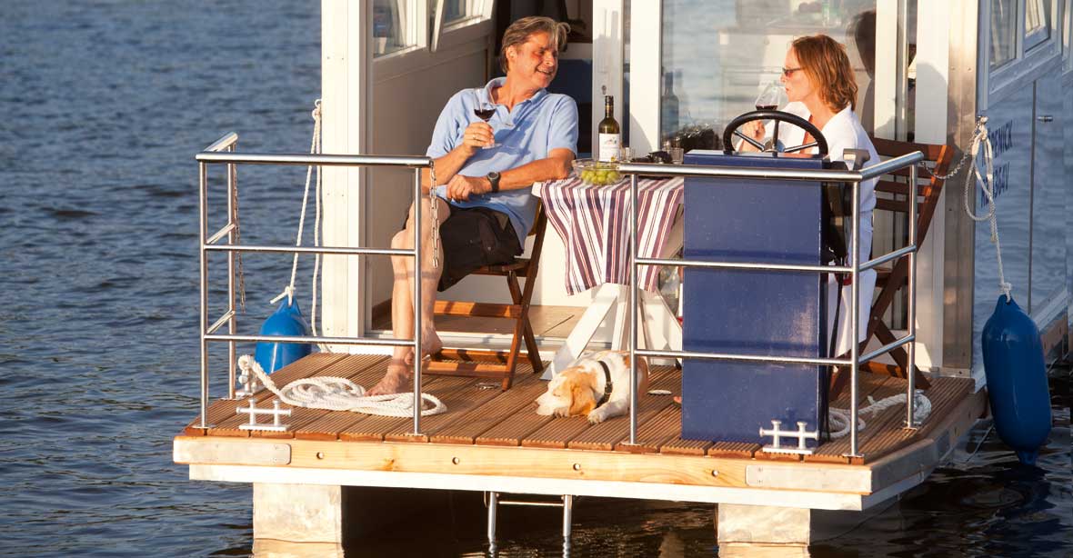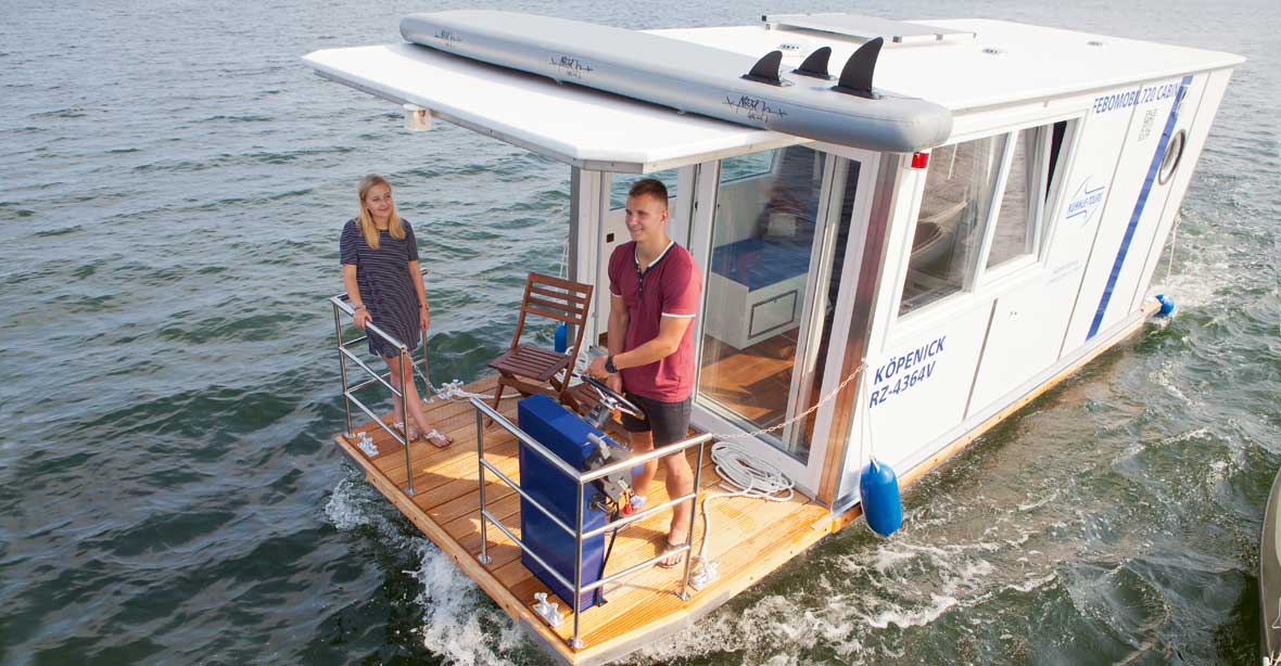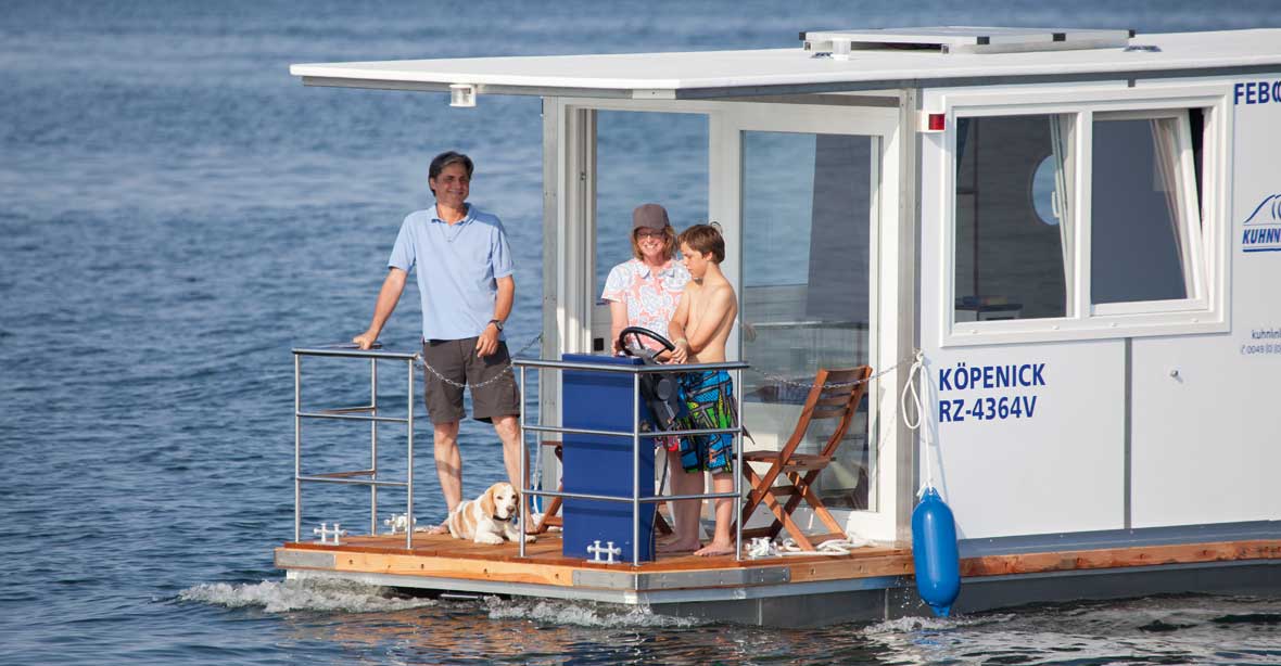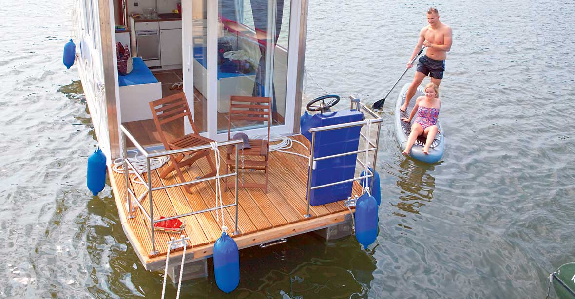Maison de vacances flottante et mobile, idéale pour deux personnes, salle de bains avec douche et toilettes, eau courante chaude/froide, kitchenette avec cuisinière et four, réfrigérateur et évier, raccordement au courant de quai (230 volts), prises électriques, chauffage dans toutes les pièces, véranda, balustrade sur la terrasse avant, dispositif pour moteur hors-bord.